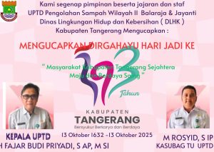Kami segenap Keluarga Besar Pimpinan Beserta Jajaran dan Staf : UPTD Wilayah II Pengolahan Sampah Kecamatan Balaraja dan Jayanti Dinas Lingkungan Hidup dan Kebersihan ( DLHK ) Kabupaten Tangerang, Mengucapkan : Dirgahayu Hari Jad / Ulang Tahun ( HUT ) Kabupaten Tangerang Ke 393 Tahun, 13 Oktober 1632 – 13 Oktober 2025 ) ” Masyarakat Kabupaten Tangerang Sejahtera, Dengan Bersyukur, Maju Dengan Berkarya, Berdaya Saing, Terus Bertumbuh Semakin Gemilang “