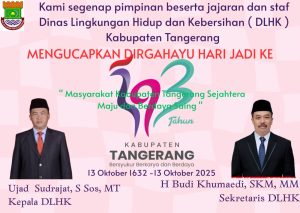 Kami segenap Keluarga Besar Pimpinan Beserta Jajaran dan Staf : Dinas Lingkungan Hidup dan Kebersihan ( DLHK ) Kabupaten Tangerang, Mengucapkan : Dirgahayu Hari Jad / Ulang Tahun ( HUT ) Kabupaten Tangerang Ke 393 Tahun, 13 Oktober 1632 – 13 Oktober 2025 ) ” Masyarakat Kabupaten Tangerang Sejahtera, Dengan Bersyukur, Maju Dengan Berkarya, Berdaya Saing, Terus Bertumbuh Semakin Gemilang “