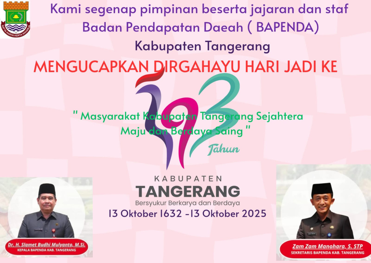 Kami segenap Keluarga Besar Pimpinan Beserta Jajaran dan Staf : Badan Pendapatan Daerah ( BAPENDA ) Kabupaten Tangerang, Mengucapkan : Dirgahayu Hari Jad / Ulang Tahun ( HUT ) Kabupaten Tangerang Ke 393 Tahun, 13 Oktober 1632 – 13 Oktober 2025 ) ” Masyarakat Kabupaten Tangerang Sejahtera, Dengan Bersyukur, Maju Dengan Berkarya, Berdaya Saing, Terus Bertumbuh Semakin Gemilang “