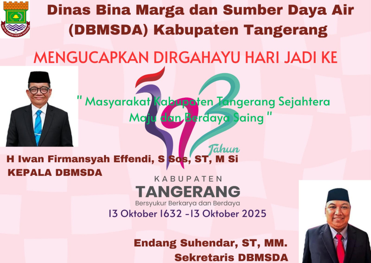 Kami segenap Keluarga Besar Pimpinan Beserta Jajaran dan Staf : Dinas Bina Marga dan Sumber Days Air ( DBMSDA ) Kabupaten Tangerang, Mengucapkan : Dirgahayu Hari Jad / Ulang Tahun ( HUT ) Kabupaten Tangerang Ke 393 Tahun, 13 Oktober 1632 – 13 Oktober 2025 ) ” Masyarakat Kabupaten Tangerang Sejahtera, Dengan Bersyukur, Maju Dengan Berkarya, Berdaya Saing, Terus Bertumbuh Semakin Gemilang “