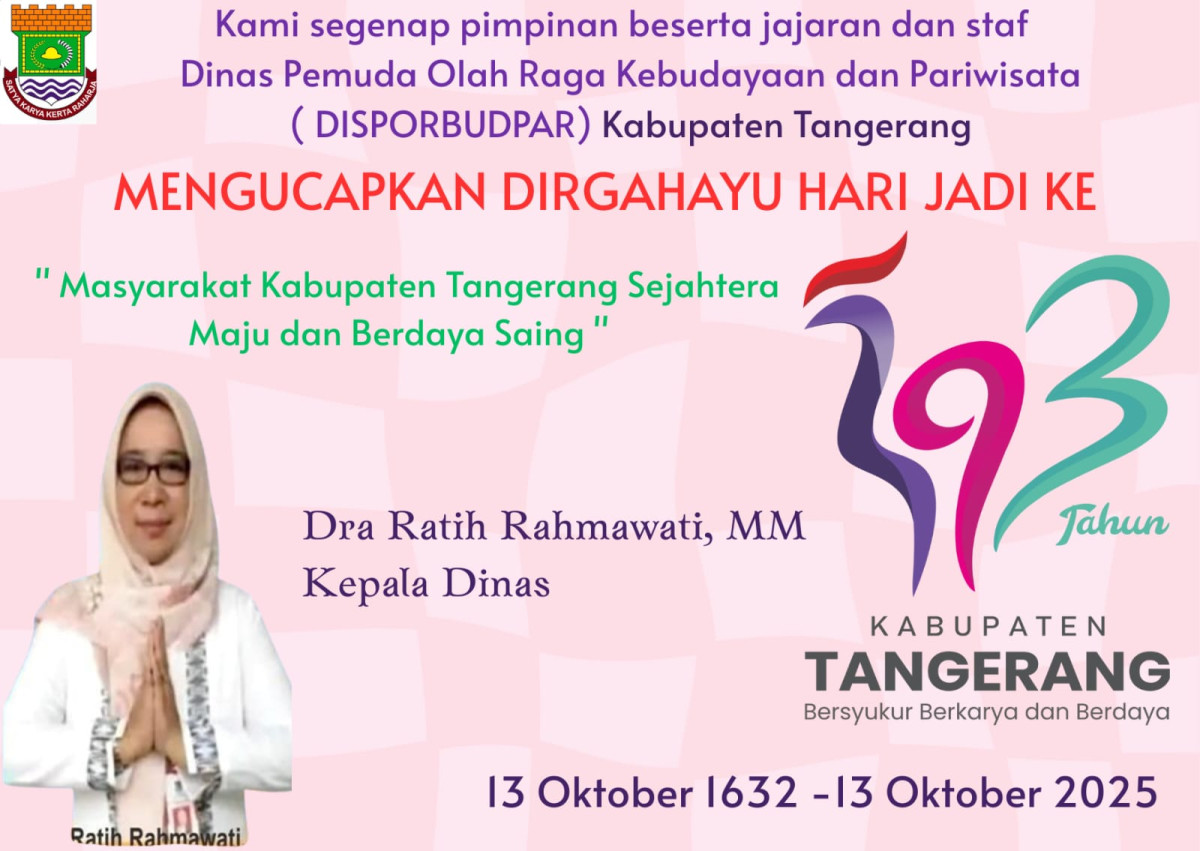 Home / Banten / Kami segenap Keluarga Besar Pimpinan Beserta Jajaran dan Staf : Dinas Pemuda Olah Raga Kebudayaan dan Paririwisata ( DISPORBUDPAR ) Kabupaten Tangerang, Mengucapkan : Dirgahayu Hari Jad / Ulang Tahun ( HUT ) Kabupaten Tangerang Ke 393 Tahun, 13 Oktober 1632 – 13 Oktober 2025 ) ” Masyarakat Kabupaten Tangerang Sejahtera, Dengan Bersyukur, Maju Dengan Berkarya, Berdaya Saing, Terus Bertumbuh Semakin Gemilang “