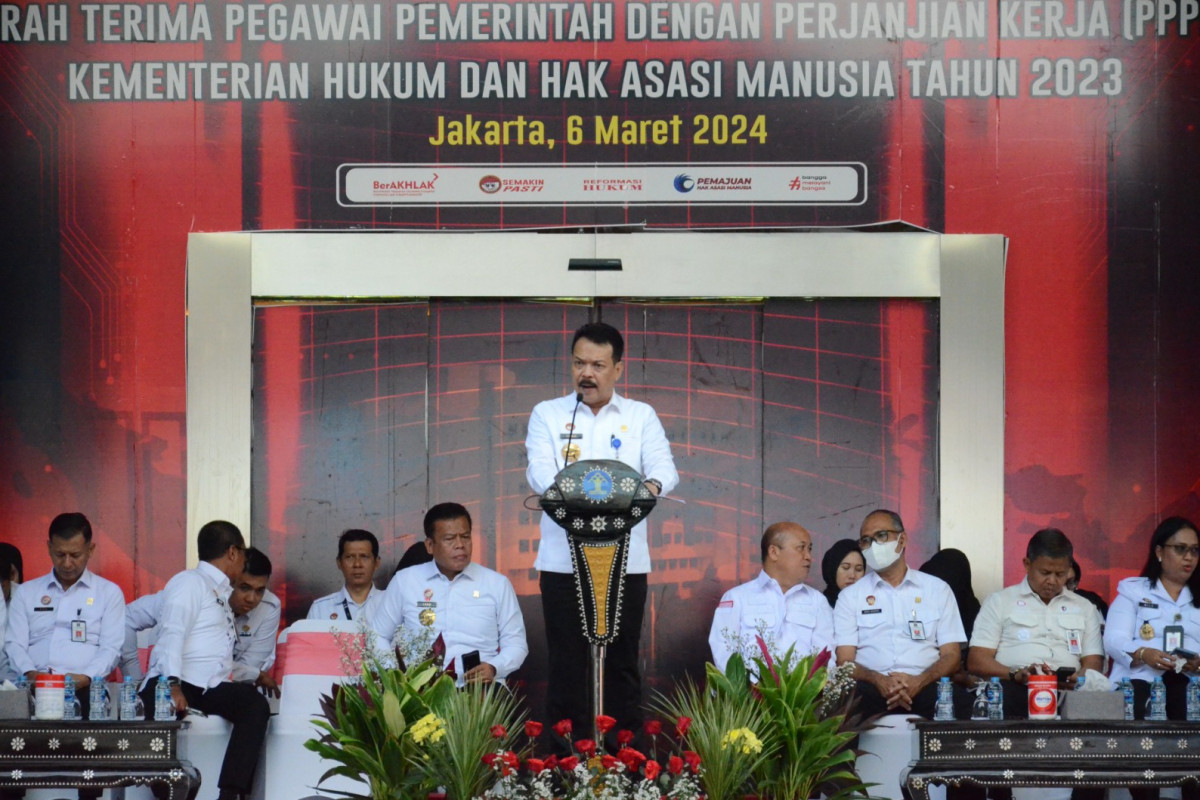 Sebagai bentuk komitmen pemerintah dalam menata pegawai non ASN, Kementerian Hukum dan HAM (Kemenkumham) telah menyelesaikan penataan tenaga non ASN dengan menetapkan 879 orang Pegawai Pemerintah dengan Perjanjian Kerja (PPPK) yang berhasil lulus tahapan seleksi akhir. Penetapan tersebut ditandai dengan kegiatan Serah Terima PPPK tahun anggaran 2023 di lapangan upacara Kemenkumham, Rabu (6/3/2024).