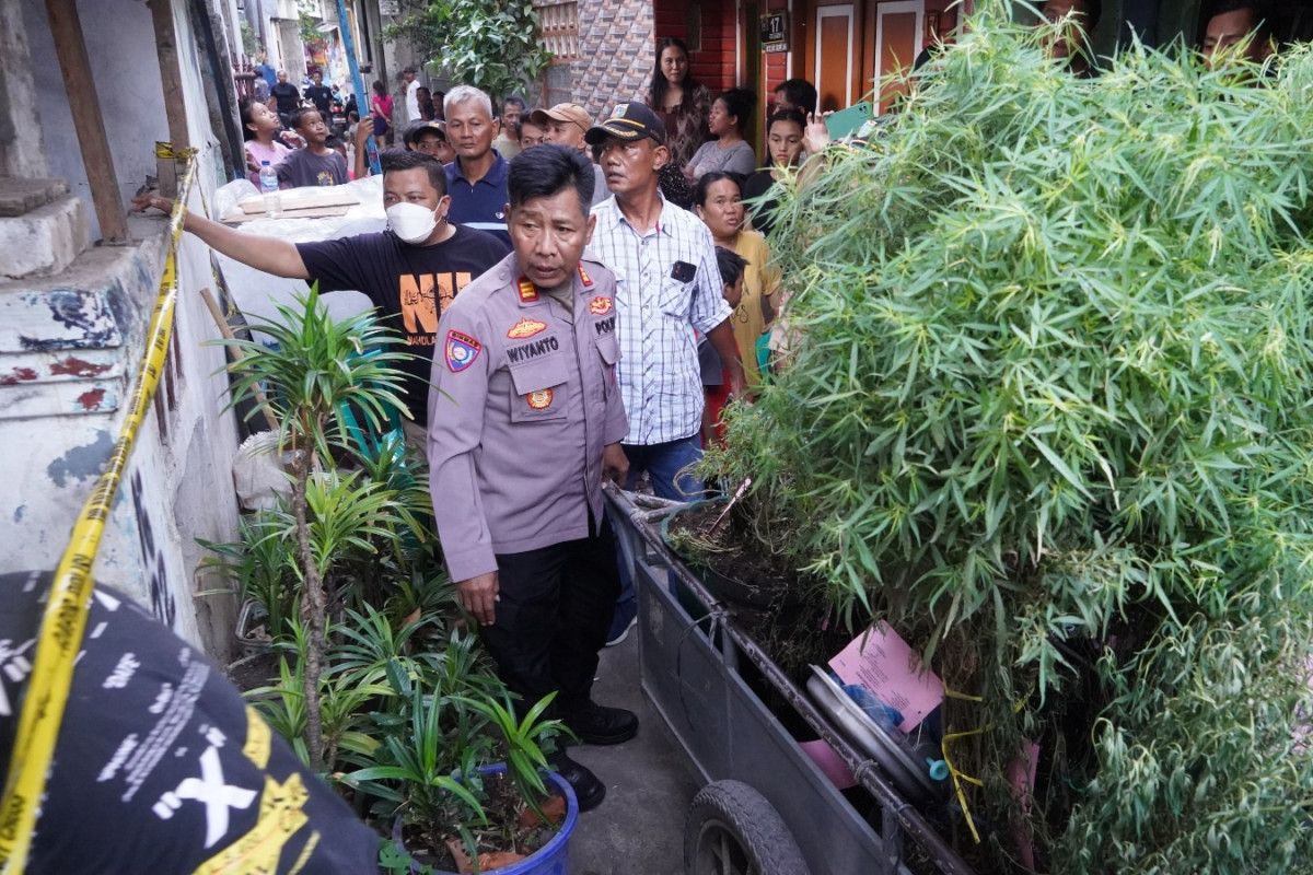 Saat memeriksa area sekitar, polisi juga menemukan 16 pot berisi 40 pohon ganja yang ditanam di atas genteng rumah.