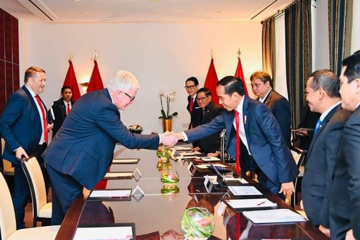Presiden Joko Widodo menggelar pertemuan bisnis dengan tiga pemimpin perusahaan Eropa di Hotel Kastens Luisenhoff, Hannover, Jerman, pada hari Minggu, 16 April 2023. Adapun perusahaan tersebut adalah BASF, Eramet, dan Volkswagen melalui PowerCo.