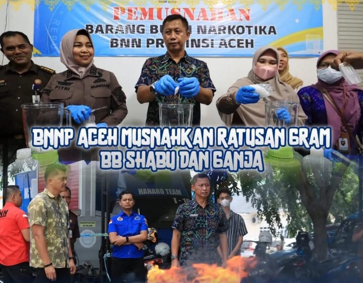 BNN Provinsi Aceh melaksanakan pemusnahan barang bukti narkotika jenis Ganja dan sabu-sabu hasil tangkapan bulan Juni sampai Agustus 2023, pemusnahan dilaksanakan dalam upaya mencegah peredaran dan penyalahgunaan narkotika di wilayah Provinsi Aceh.