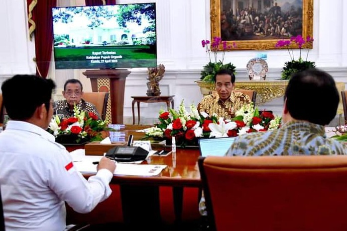 Presiden Joko Widodo memimpin rapat terbatas bersama jajarannya di Istana Merdeka, Jakarta, pada Kamis, 27 April 2023. Dalam rapat tersebut, Presiden meminta pengurangan ketergantungan terhadap pupuk kimia dengan meningkatkan penggunaan pupuk organik bagi para petani.