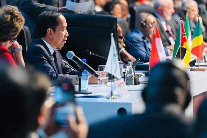 “Kita semua melihat tatanan ekonomi dunia saat ini sangat tidak adil, gap pembangunan semakin lebar, rakyat miskin dan kelaparan semakin bertambah,” ucap Presiden.