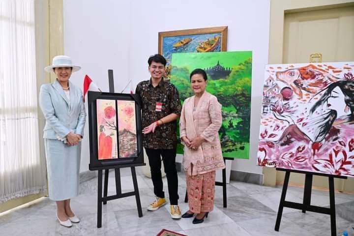 Sementara Presiden Jokowi dan Kaisar Naruhito mengadakan pertemuan empat mata atau _tête-à-tête_, Ibu Iriana mengajak Permaisuri Masako untuk menyaksikan pelukis difabel Benediktus Anfield melukis ikan koi.