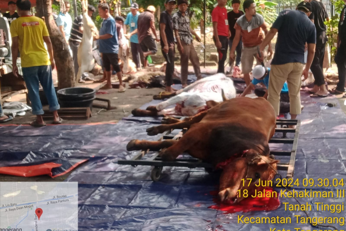 Pemotongan hewan kurban sapi dan kambing yang di selenggarakan di dalam komplek perumahan kehakiman di wilayah Kelurahan Tanah Tinggi Kota Tangerang, Senen 17/06/2024.