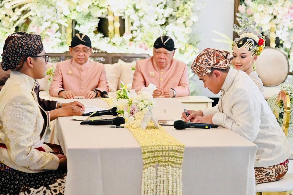 Selepas itu, prosesi dilanjutkan dengan penyerahan buku nikah oleh petugas kantor urusan agama (KUA) kepada kedua mempelai, diikuti dengan penyerahan mahar dan mas kawin. Setelah itu, kedua pengantin menuju pelaminan dan melakukan prosesi pemasangan cincin. Tampak cucu Jokowi, Jan Ethes Srinarendra dan Sedah Mirah Nasution membawakan cincin bagi kedua mempelai.