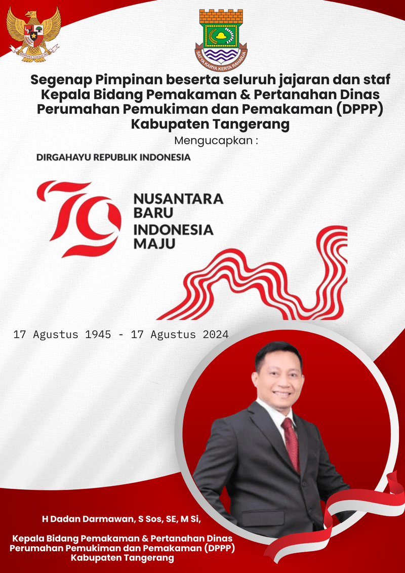 Kami segenap Keluarga Besar Pimpinan Beserta Jajaran dan Staf : Kepala Bidang Pemakaman dan Pertanahan, Pada Dinas Perumahan Pemukiman dan Pemakaman ( DPPP ) Kabupaten Tangerang, Mengucapkan : Dirgahayu Hari Ulang Tahun Republik Indonesia ( HUT RI ) Ke 79 Tahun, 17 Agustus 1945 – 17 Agustus 2024 ) ” Nusantara Baru Indonesia Maju “