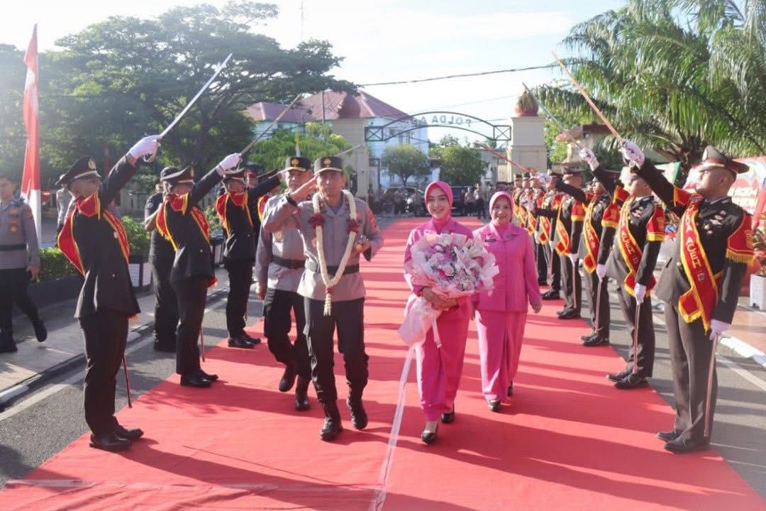 Kapolda Aceh yang baru, Brigjen Pol Drs. Marzuki Ali Basyah, bersama istri Ny. Irawati Marzuki tiba di Mapolda Aceh. Kehadiran keduanya disambut hangat dengan tarian Ranup Lampuan, Sabtu, 23 Agustus 2025