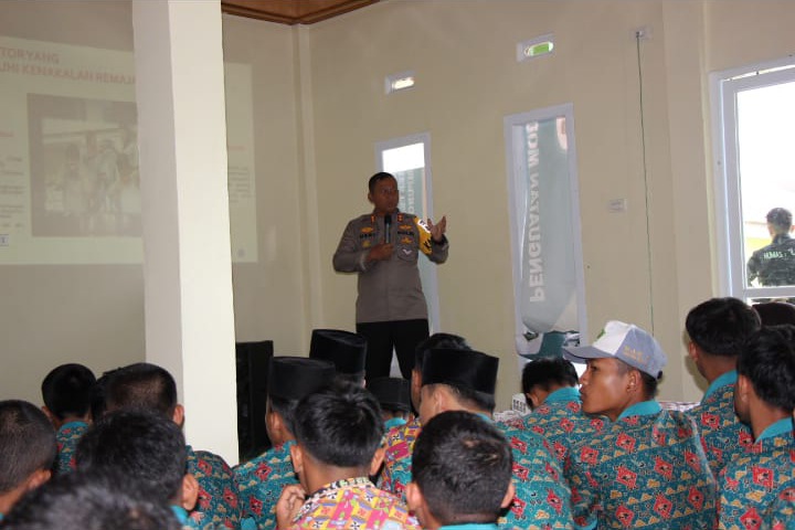 Kapolres Lampung Barat AKBP Heri Sugeng Priyantho, S.I.K., M.H. memberikan materi wawasan kebangsaan, kenakalan remaja , bahaya narkoba dan safety riding pada kegiatan police go to school.