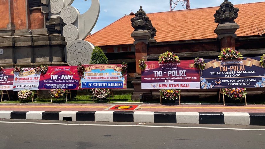 Karangan bunga untuk memberikan ucapan selamat dan terima kasih terhadap Polri dan TNI dalam mengamankan serta menyukseskan Presidensi KTT-G20 yang dilaksanakan 15-16 November di Nusa Dua Bali.