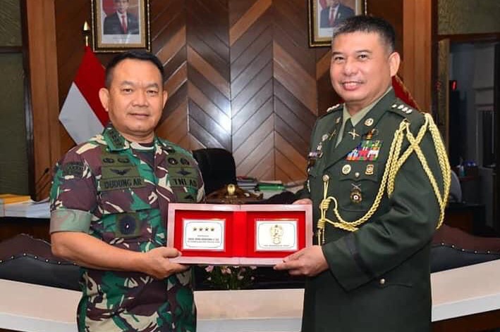 Kepala Staf Angkatan Darat (Kasad) Jenderal TNI Dudung Abdurachman, S.E., M.M., menerima kunjungan Atase Pertahanan Kedutaan Besar Filipina Colonel Emmanuel A Canilla PA (GSC) di Ruang Kerja Kasad Markas Besar Angkatan Darat (Mabesad), Jakarta Pusat, Selasa (15/3/2022).