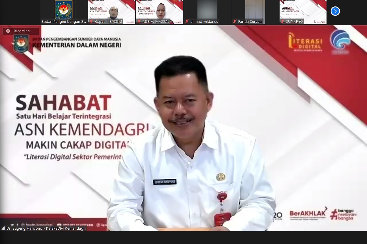 Kepala Badan Pengembangan Sumber Daya Manusia (BPSDM) Kementerian Dalam Negeri (Kemendagri) Sugeng Hariyono berharap Aparatur Sipil Negara (ASN) dapat beradaptasi dengan perubahan digital. Menurutnya, ASN perlu didorong agar memiliki kompetensi yang bukan hanya sekadar normatif, tetapi juga dapat memanfaatkannya secara optimal sejalan dengan kemajuan teknologi dan informasi digital. Karena itu, BPSDM Kemendagri menggelar kegiatan Satu Hari Belajar Terintegrasi (SAHABAT) Seri ke-4 dengan tema “Literasi Digital Sektor Pemerintahan”, yang berlangsung pada Rabu (20/7/2022).