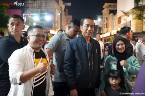 Suatu malam menjelang tahun baru 2024, Presiden Joko Widodo menelusuri jalan sekitar Pasar Pon, Kota Surakarta, Provinsi Jawa Tengah, pada Minggu, 31 Desember 2023, untuk menemui masyarakat. Tampak antusiasme masyarakat menyambut kedatangan Presiden Jokowi.