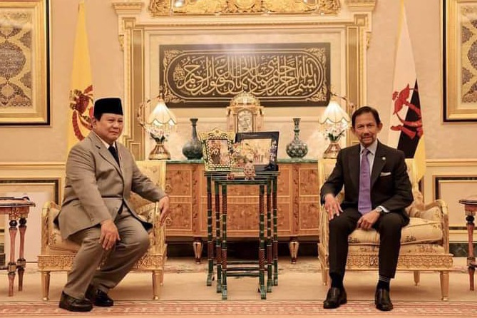Menteri Pertahanan Republik Indonesia (Menhan RI) Prabowo Subianto menemui Yang Maha Mulia Seri Sultan Haji Hassanal Bolkiah di ruang Audience Ratna Kencana, Istana Nurul Iman. Pertemuan dimulai sekitar pukul 14.30 waktu setempat.