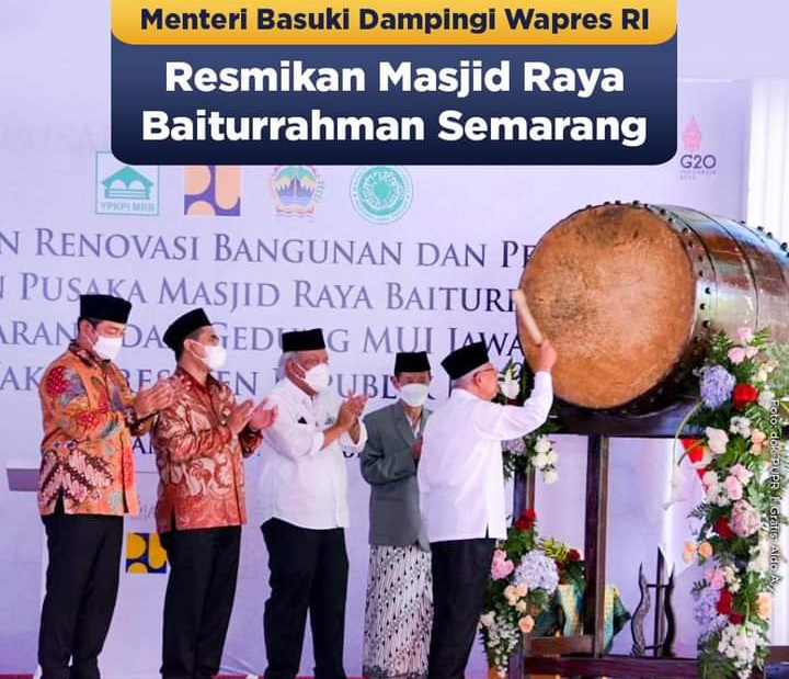 Menteri PUPR Basuki Hadimuljono mendampingi Wakil Presiden RI Ma’ruf Amin meresmikan Masjid Raya Baiturrahman Semarang yang telah selesai direnovasi oleh Kementerian Pekerjaan Umum dan Perumahan Rakyat RI , Jumat (23/9/2022).