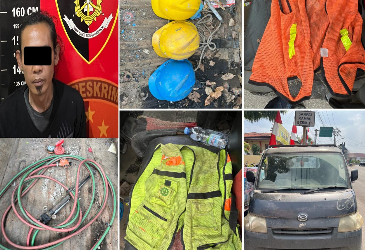Barang bukti yang diamankan meliputi satu unit mobil pickup Daihatsu Grandmax warna hitam dengan nomor TNKB BG 9625 DK, dua tabung oksigen berkapasitas 60 kg, dua selang blender panjang 7 meter beserta alat cutting besi, satu rompi kerja warna hijau, satu rompi kerja warna oranye, dua helm kerja warna kuning, satu helm kerja warna biru, dan satu kunci inggris.
