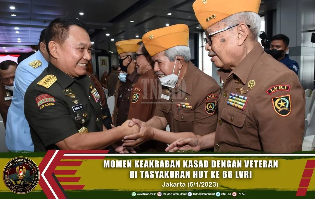 Momen keakraban dan rasa hormat kepada senior serta sesepuh TNI kembali tergambar saat Kepala Staf Angkatan Darat (Kasad) Jenderal TNI Dr. Dudung Abdurachman menghadiri acara Tasyakuran HUT ke 66 Legiun Veteran Republik Indonesia (LVRI) di Gedung Pierre Tendean Kemhan RI, Jakarta. Kamis, (5/1/2023).
