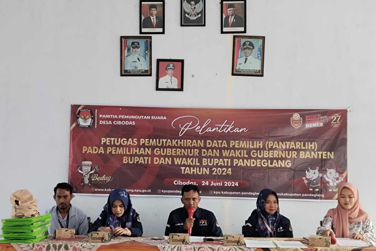 Dalam rangka persiapan Pemilihan Gubernur dan Wakil Gubernur Banten serta Bupati dan Wakil Bupati Pandeglang yang akan datang, pelantikan petugas Pemutakhiran Data Pemilih (Pantarlih) Desa Cibodas telah dilaksanakan dengan khidmat Bertempat di Sekretariat PPS Desa Cibodas, Kecamatan Banjar, Kabupaten Pandeglang, Provinsi Banten,” Senin 24 Juni 2024.