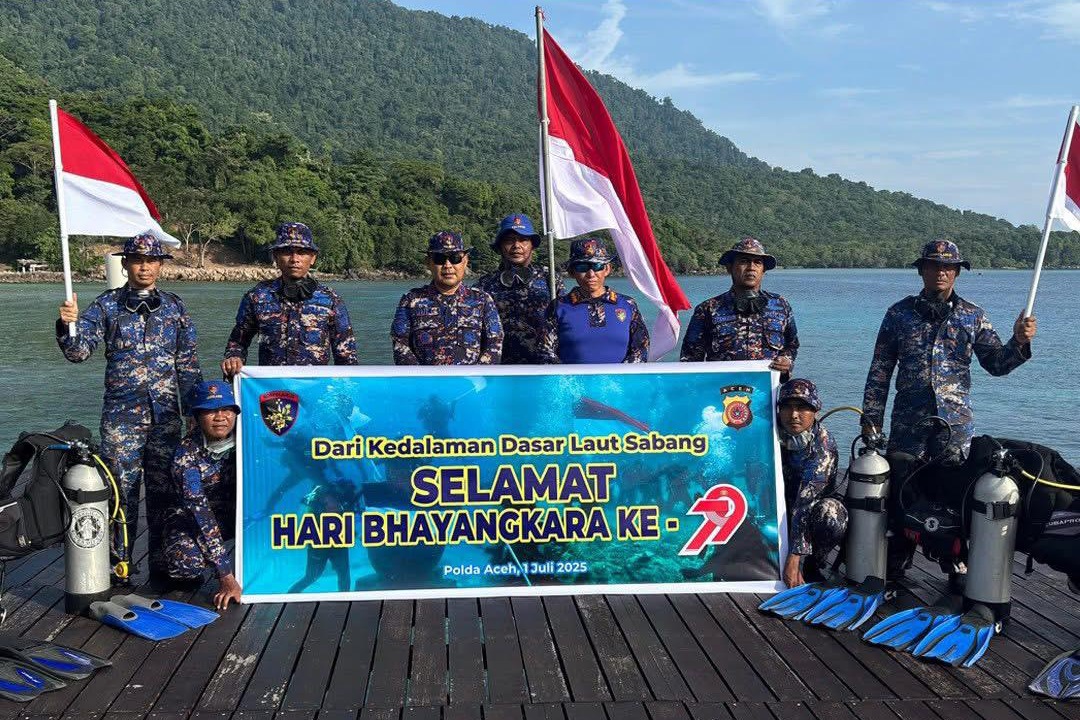 Dalam rangka memperingati Hari Bhayangkara ke-79, Direktorat Polisi Perairan dan Udara (Ditpolairud) Polda Aceh melaksanakan pengibaran bendera Merah Putih di dasar laut perairan Sabang, Sabtu pagi, 28 Juni 2025.