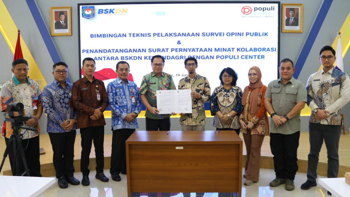 Badan Strategi Kebijakan Dalam Negeri (BSKDN) Kementerian Dalam Negeri (Kemendagri) terus memperkuat pendekatan kebijakan berbasis data dengan menggandeng Populi Center dalam membangun sistem survei opini publik yang terukur dan ilmiah. Kolaborasi strategis ini ditandai dengan penandatanganan Surat Pernyataan Minat Kolaborasi dan pelaksanaan Bimbingan Teknis (Bimtek) Pelaksanaan Survei Opini Publik yang diselenggarakan di Command Center Kantor BSKDN, Jakarta, Kamis (19/6/2025).