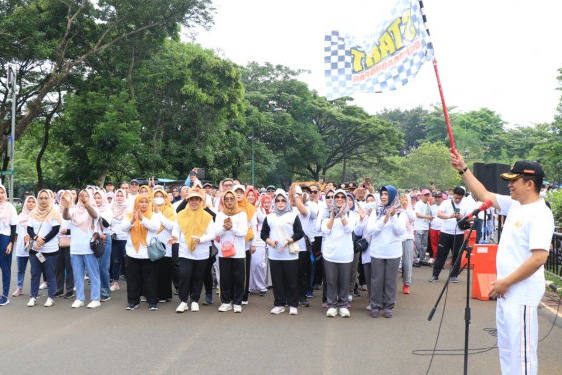 (Pj) Bupati Tangerang Andi Ony melepas gerak jalan santai dan membuka kegiatan bazar sembako murah dalam rangka HUT ke-52 Korpri, HUT ke-78 PGRI, dan peringatan Hari Kesehatan 2023, Kamis 7/12/223.