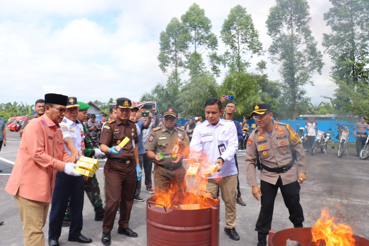 Usai apel gelar, Polres Kotawaringin Barat (Kobar) melaksanakan pemusnahan barang bukti (barbuk) hasil kegiatan rutin yang ditingkatkan (KRYD) dan operasi pasar selama bulan Ramadhan 1445 H / 2024 M, Rabu (3/4/2024) pagi di halaman uji praktek SIM Satlantas Polres Kobar.