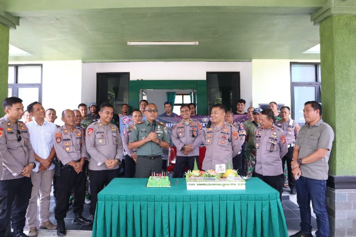 Polres Pesisir Barat gerebek kantor TNI Dalam Rangka memberikan ucapan selamat HUT TNI ke 78 Tahun 2023 bertema “Pengawal Demokrasi Untuk Indonesia Maju”, di Koramil 0422-03 Pesisir Tengah Pekon Lintik Kecamatan Krui Selatan Kabupaten Pesisir Barat, Kamis (05/10/2023)