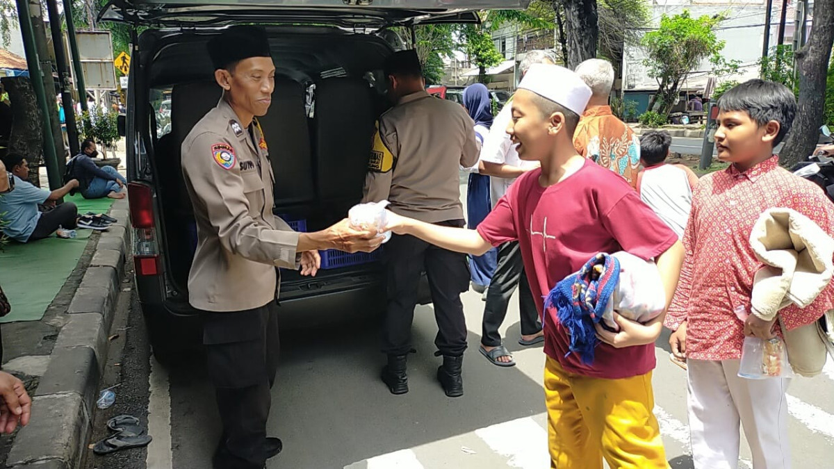 AIPTU Sutopo Bhabinkamtibmas Kelurahan Rawa Terate, bersama AIPDA Tri Pujianto Bhabinkamtibmas Kelurahan Cakung Barat, serta AIPTU Acep Kasi Humas Polsek Cakung, turun langsung membagikan makanan ringan dan air mineral kepada jamaah masjid sebagai bagian dari program sosial yang rutin dilakukan Polsek Cakung setiap Jumat.