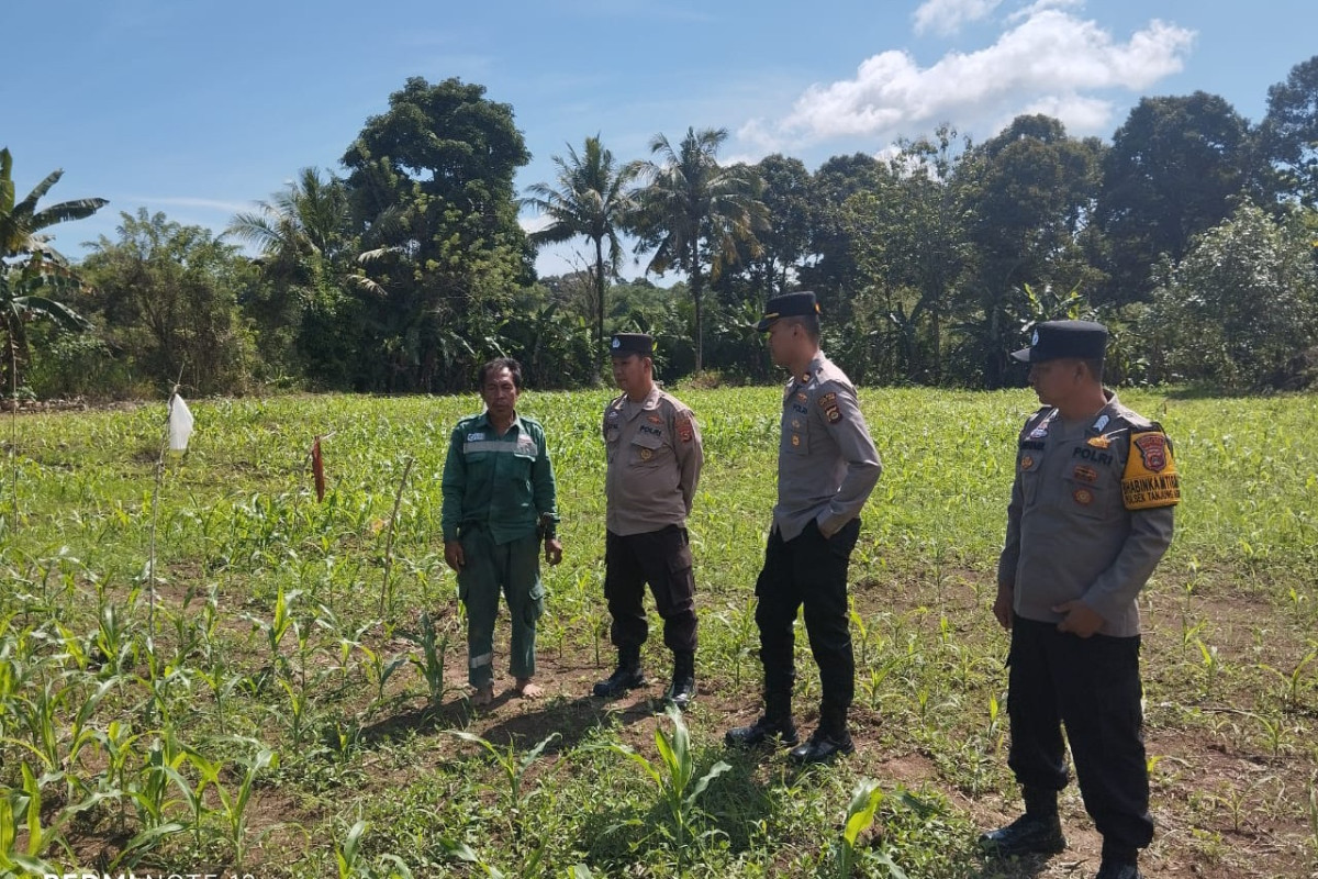 Kapolsek Tanjung Agung IPTU Michael Leonardo Werluka SH, S.Tr.K. bersama personelnya turun langsung melakukan pengecekan perkembangan tanaman jagung di lahan milik saudara Khairul yang dikelola oleh Syamsul Bahri penuh dedikasi.