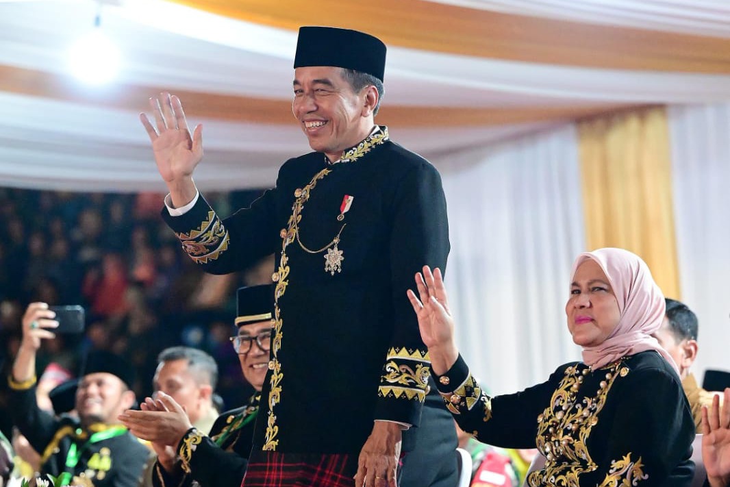 Kompak menggunakan pakaian Ta’wo, Presiden yang didampingi Ibu Iriana Joko Widodo tiba di stadion sekitar pukul 19.30 WITA.
