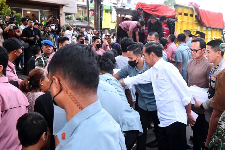 Tiba di lokasi sekitar pukul 13.30 WIB, Presiden Jokowi langsung menyapa masyarakat yang tengah mengantre di belakang truk pengangkut sembako. Sambil melihat distribusi sembako, Presiden juga memberikan amplop dan hamper berisi kue untuk beberapa masyarakat.