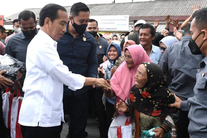 Presiden kemudian berkeliling pasar seraya menyerahkan sejumlah bantuan sosial kepada para pedagang dan masyarakat di Pasar Selo. Saat berkeliling, Presiden juga menanyakan sejumlah harga kebutuhan pokok kepada para pedagang, mulai dari beras, minyak, telur, hingga daging.