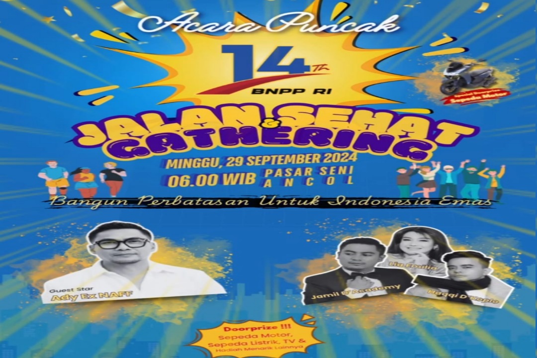 Badan Nasional Pengelolaan Perbatasan Republik Indonesia (BNPP RI) merayakan Puncak HUT ke-14 dengan menggelar jalan sehat dan gathering di Pasar Seni Ancol, Jakarta, Minggu (29/9/2024).