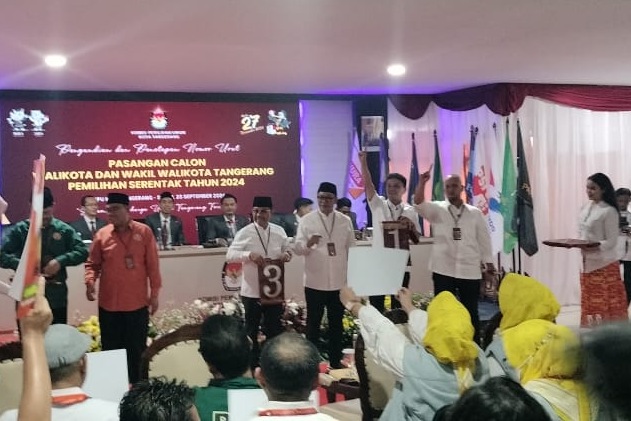 Suasana penuh semangat menyelimuti KPUD Kota Tangerang pada Senin, 23 September 2024, saat pasangan Calon Wali Kota dan Wakil Walikota Kota Tangerang Sachrudin-Maryono melakukan pengambilan nomor urut untuk Pilkada 2024.