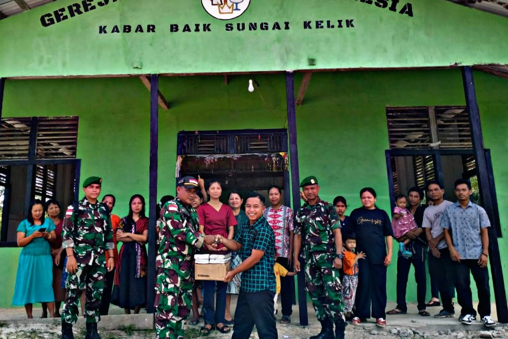 Komandan Kompi (Danki) SSK 3 Kapten Czi Nur Kasriadi turun langsung membagikan sejumlah Alkitab kepada jemaat Gereja Kemah Injil Indonesia di Sei Kelik, Kapuas hulu, Kalimantan Barat, Minggu 16/06/2024.